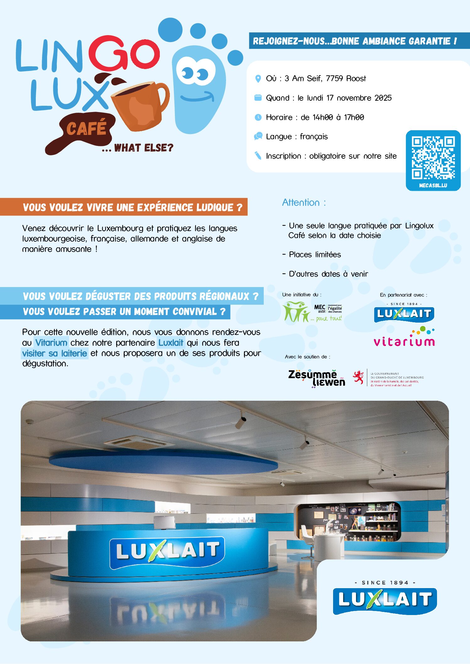 Looking for a fun experience? Come discover Luxembourg and practice your French! Want to taste regional products and spend a friendly moment? We invite you to a new edition of our LinGolux Café at our partner LuxLait. A fun afternoon of language practice and a visit to the LuxLait dairy!
