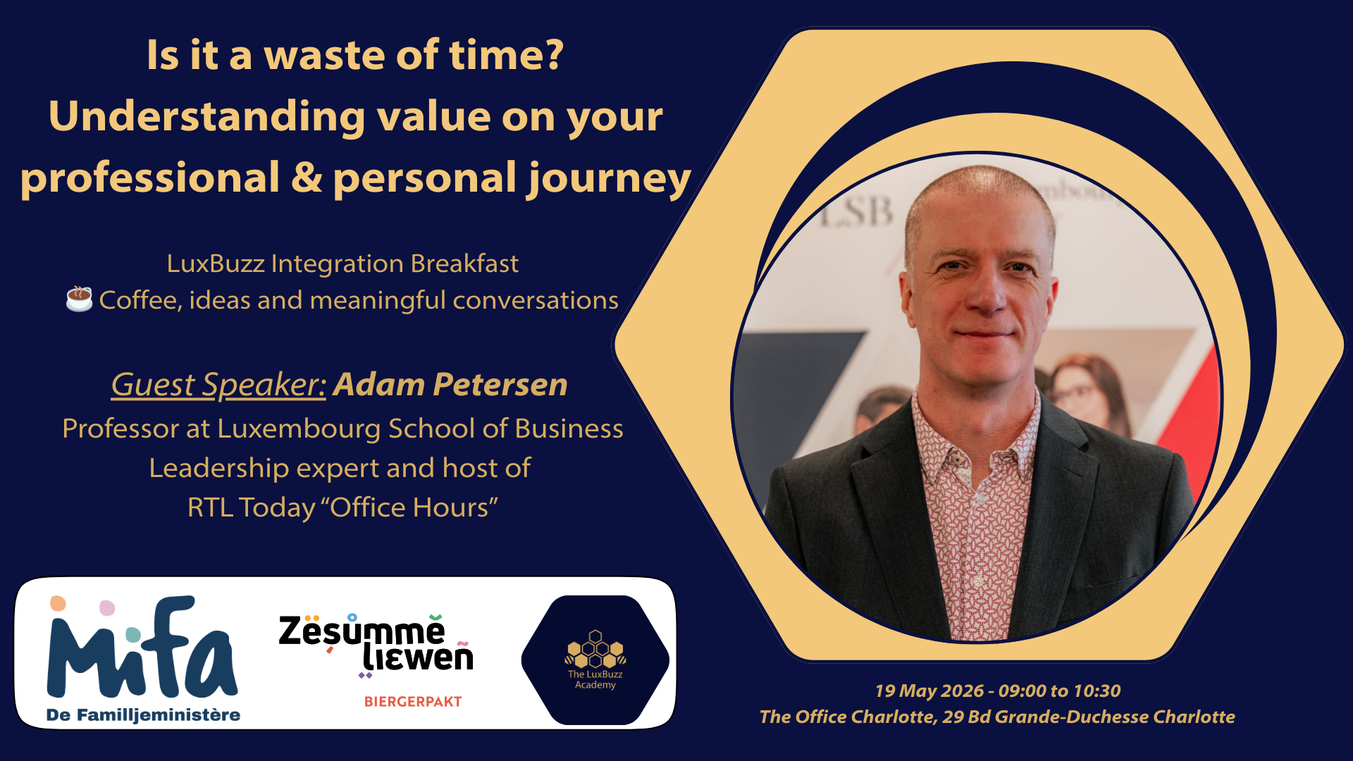 Wärend dësem partizipative Frühstück wäert den Adam Petersen, e Leadership- a perséinlech Entwécklungstrainer vun der Luxembourg School of Business, seng Abléck an Erfarungen iwwer d’Wichtegkeet vun engem bessere Verständnis vun de Stäerkten, Talenter a wat deen eenzegaartege Wäert ausmécht, deelen.